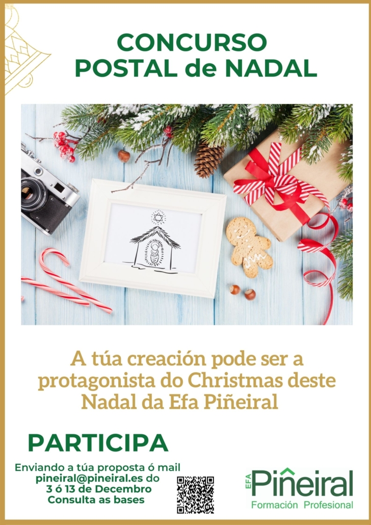Decembro, un dos meses e momentos máis especiais do ano para todos nos. En Piñeiral, chegadas estas datas, adoitamos felicitar ás nosas familias, colaboradores e amigos cunha mensaxe navideña. Este ano, queremos facer máis partícipes que nunca á nosa comunidade educativa, e decidimos propoñer o I Concurso da postal de Nadal da Efa Piñeiral. Os alumnos dos distintos ciclos formativos poden presentar ata 3 propostas da imaxe que será a protagonista do Christmas navideño do centro.